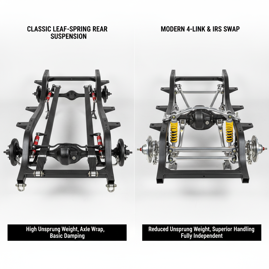 - Ultimate handling? Consider bolt-in IRS swaps (Heidts, Morrison, Art Morrison IRS, typically $5500–$9000 per axle)