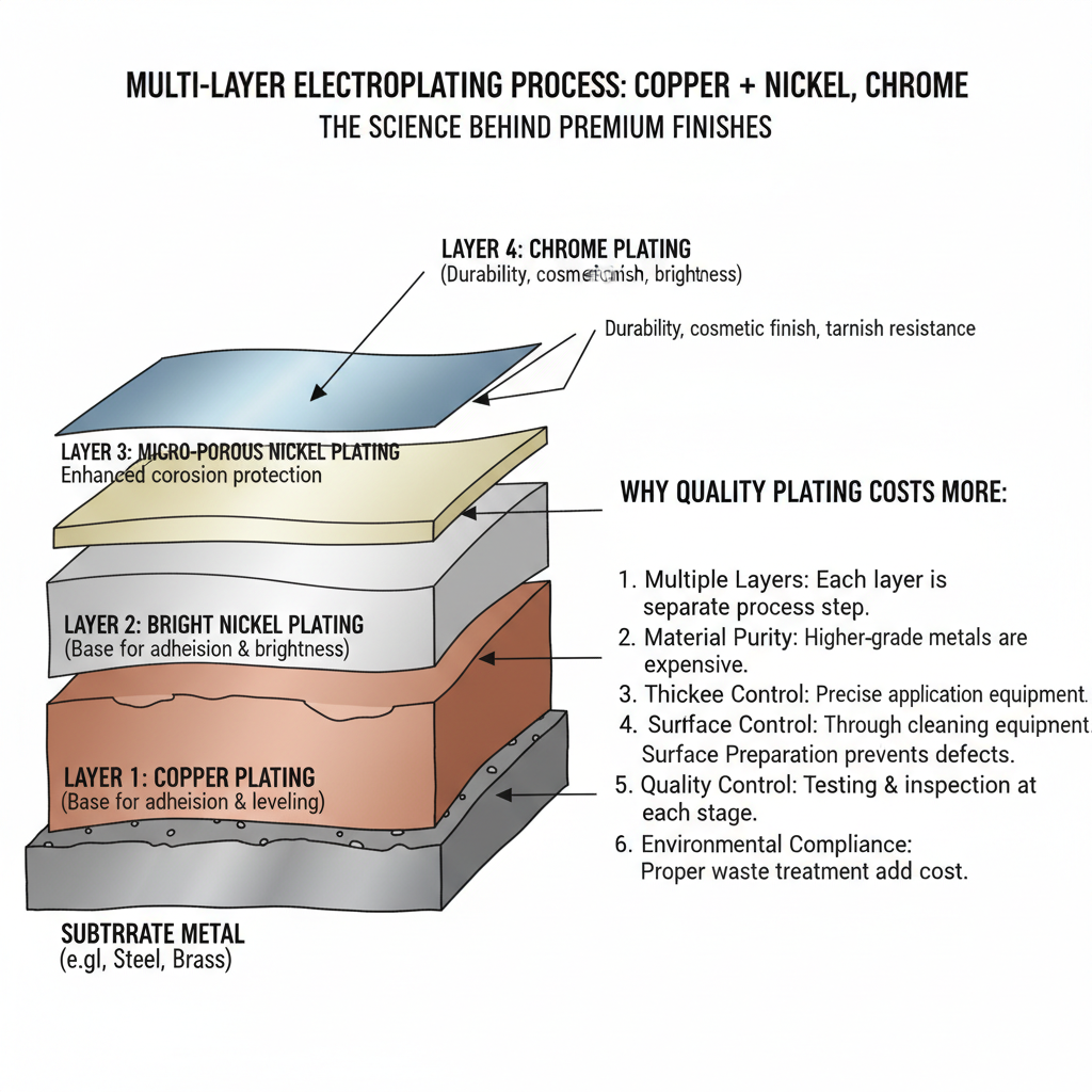 - Final Chrome Layer: Thickness and purity affect shine and durability.
